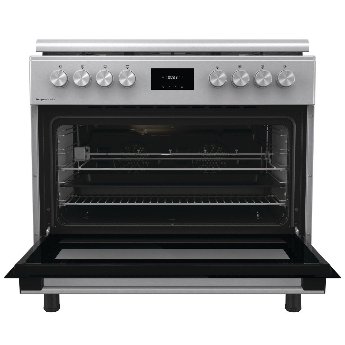 بوتاجاز غاز 90 سم , استانليس ستيل، 5 شعلات غاز، بسعة صافية 92 لتر مع مروحتين ، حوامل زهر، وظيفة المقلاه الهوائية – GGI9C20X