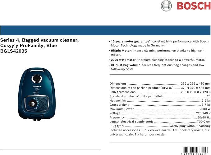 مكنسة كهربائية 2000 وات كوزي برو فاميلي من السلسلة 4 BGLS42035 من بوش – ازرق