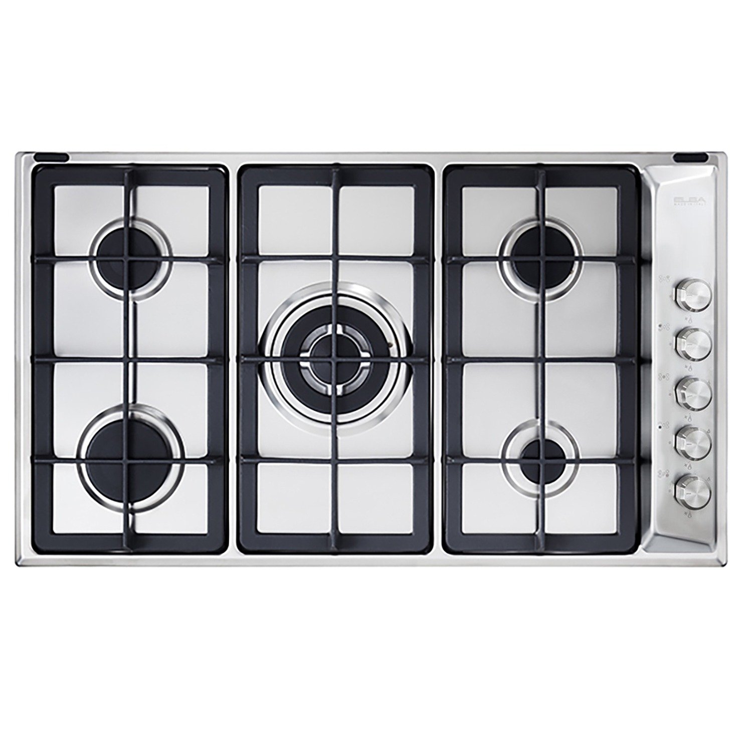 مسطح غاز بيلت ان إلبا، 90 سم، ستانلس ستيل، 5 شعلات، مقابض تحكم جانبية، حامل مقلاة من الحديد الزهر.