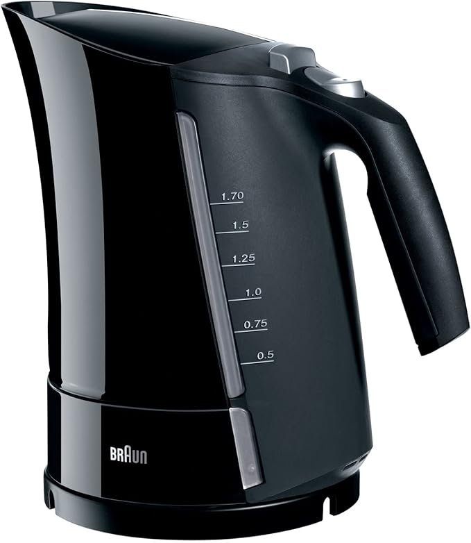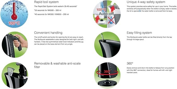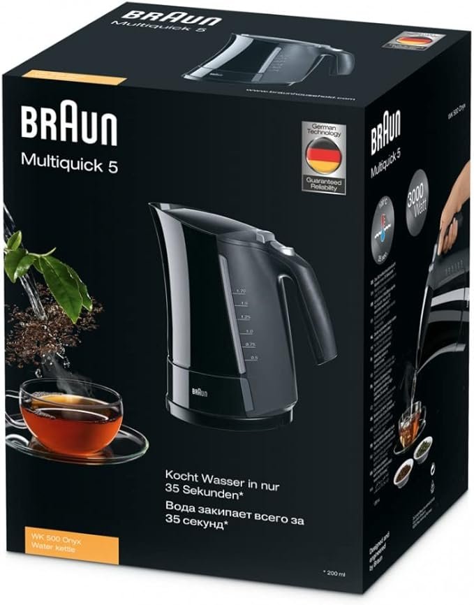 غلاية براون ملتي كويك 5 الكهربائية، سعة 1.7 لتر، 3000 واط، نظام غليان سريع، حماية أمان رباعية الاتجاهات – WK500 أسود